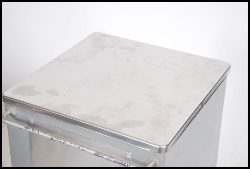 A superb vintage 20th century Industrial enamel metal industrial medical cabinet on wheels. The upright pedestal having twin doors with polished top. All raised on vintage castors. Measures 88cm high x 42cm wide x 47cm deep.