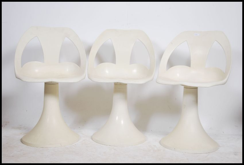 A set of retro 20th century white bar stools raised on tulip style bases with shaped and pierced seats atop ( see illustrations )
