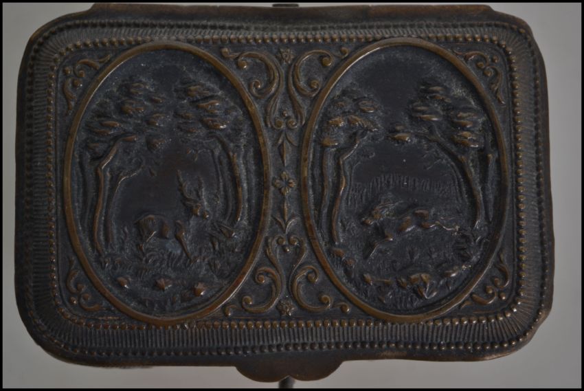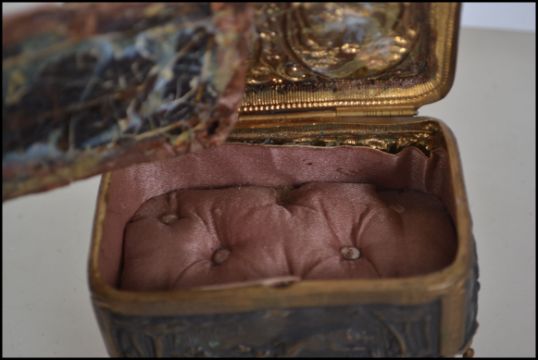 A stunning 19th brass ladies miniature jewellery casket box being case in repousse with scenes of hunting dogs and boar along with deer in forest scenes. Raised on acanthus leaf legs with the interior being lined. measures 9cm wide.