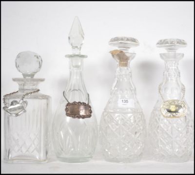 A pair of cut glass decanters together with 2 other cut glass decanters, one being Edinburgh crystal. One having a silver hallmarked port label, 2 others in white metal+