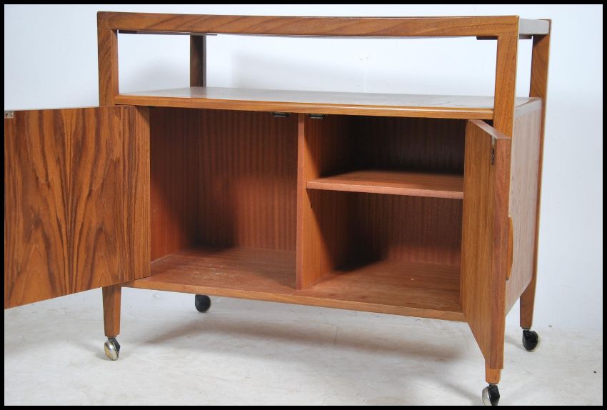 A 1970's retro G-Plan type extending teak wood serving trolley being raised on castors to the base with handles either end having flip over top