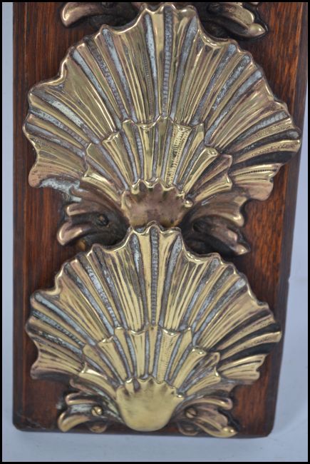 A late 19th / early 20th century oak wall mountable letter / newspaper rack. Having an oak back plate with three brass scalloped racks.