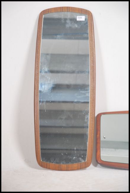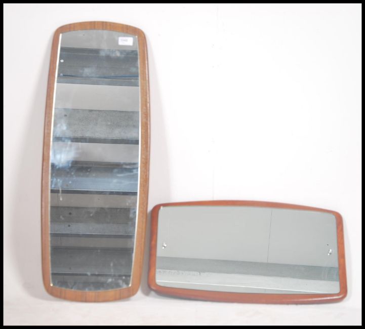 2 vintage 20th century 1970's G-Plan style atomic frameless wall mirrors. The mirrors of shaped sputnik form set to chamfered edge teak backs. Measures 80cm high x 30cm wide.