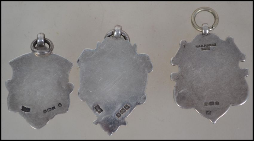 3 silver hallmarked armorial fobs, each with plain cartouche centres. Hallmarked for Birmignham, early 20th century makers RP x 2 and another. One with 9ct gold centre. Total weight 26.1g