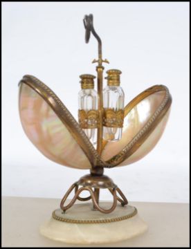 A 19th century Continental mother of pearl and gilt metal perfume bottle holder, the alabaster base supporting a wire work gilt stand, surmounted by two opening shells enclosing two faceted glass perfume bottles, in pierced gilt metal mounts.