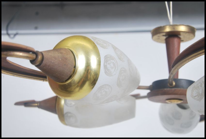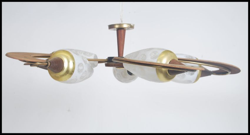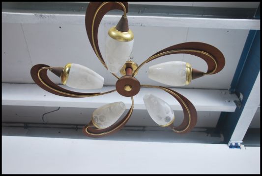 A vintage retro 20th century teak wood fan and five point  light fixture having conical class shades.