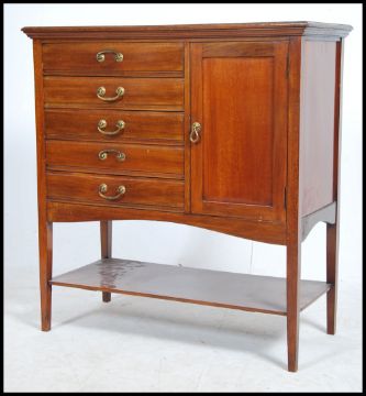 An Edwardian mahogany music cabinet. Having a bank of five drawers with adjoining cupboard. Raised on tapering legs united by a single tier. With applied plaque for Muirhead and Turnball. Measures 85cm high x 80cm wide x 37cm deep.