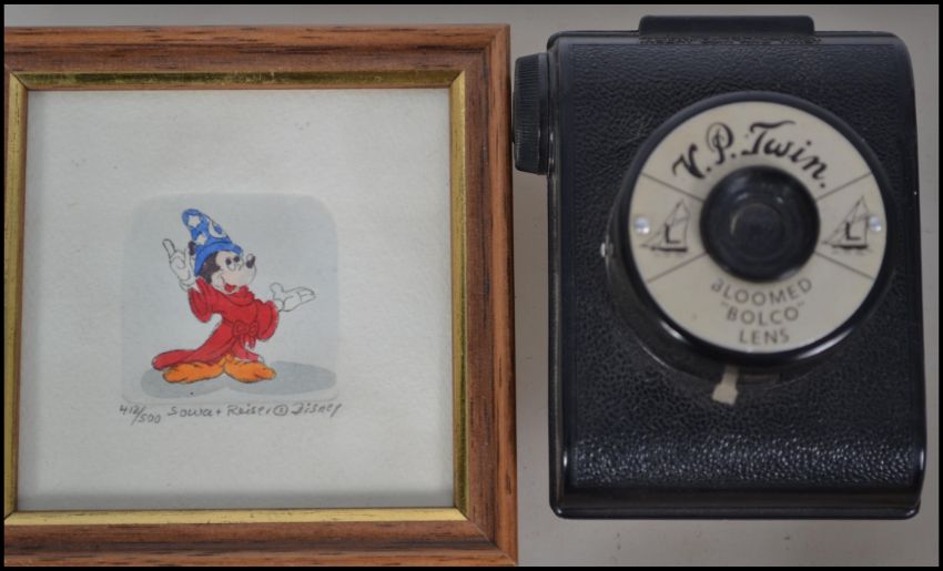 A dealers lot to include a Briar smoking pipe in the form of a Buffalo, an abalone shell adorned trinket pot, an unusual resin handle in the form of a dog, a VP Twin bloomed Bolco lens camera and a Walt Disney framed ltd edition print and a resin Chinese figurine of a deity