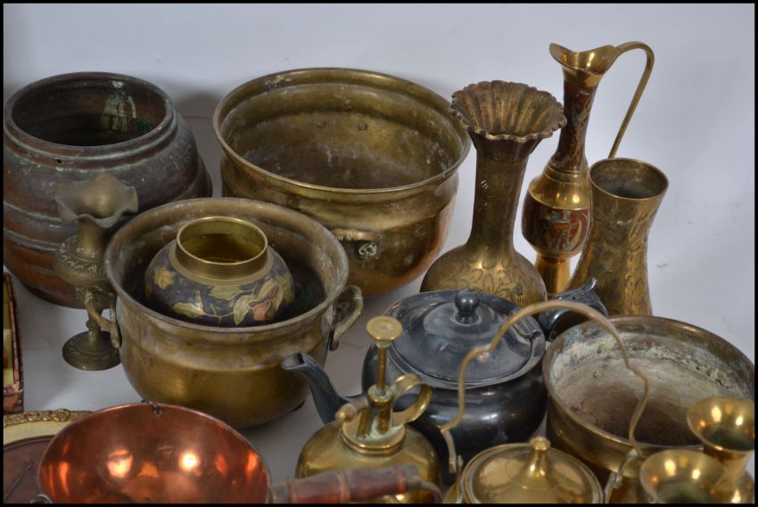 A large mixed lot of various brass ware and silver plated goods to include: teapot; horse brasses on leather; a chased coffee pot of Islamic interest; several chased vases; a set  of cloisonne lidded jars; a boxed set of teaspoons along with many other items. The tallest measures 41cm high.