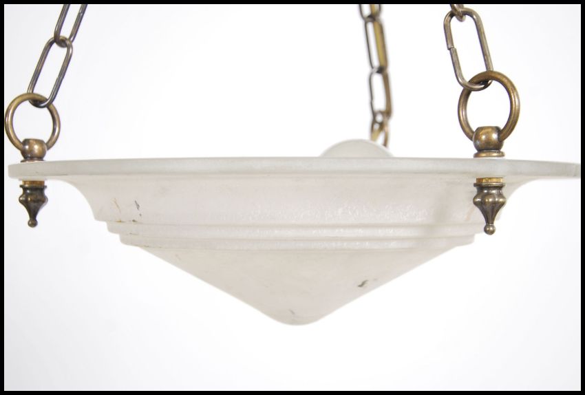 A contemporary 20th century ceiling light having three brass chain links with a circular convex mottled glass shade.