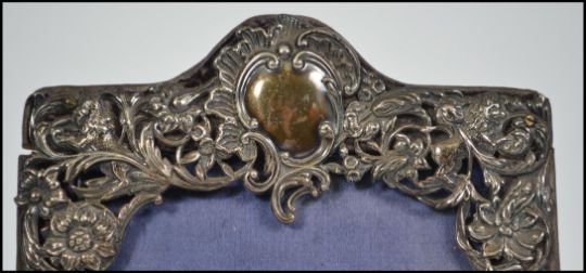 A Victorian silver hallmarked rococo picture frame having an easel back. Hallmarked for William Comyns, London, date letter b for 1897. Weight 208.2g / Size  18cms high