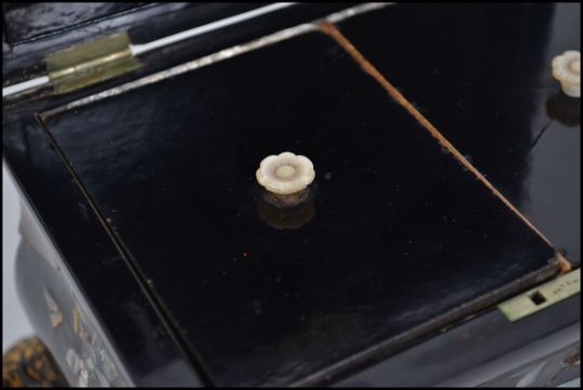 A 19th Century Victorian papier mache tea caddy with original interior, decorated with hand painted floral sprays and mother of pearl inlay. Measures 13cm high x 21cm wide x 14cm deep.