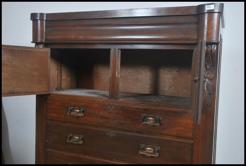 A very large Victorian Scottish mahogany chest of drawers on stand. Raised on turned legs to the stand having a large and tall chest of drawers. The top drawer over twin acid etched mirror glass linen cupboard with further drawers beneath. The drawers being flanked by carved embellished sides. Dismantles into 2 pieces for ease of movement