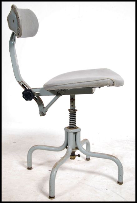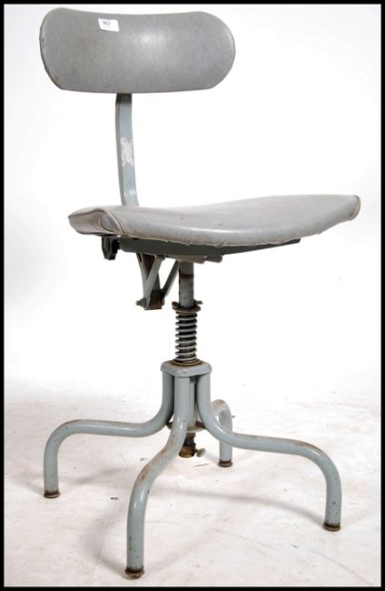 A mid century Industrial office swivel chair raised on a tubular metal frame with grey vinyl swivel seat and back rest. Measures 85cm high x 45cm wide x 55cm deep.