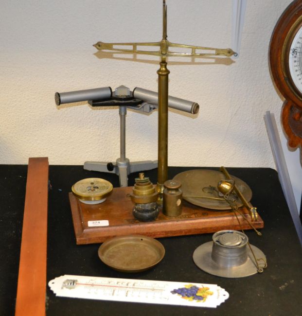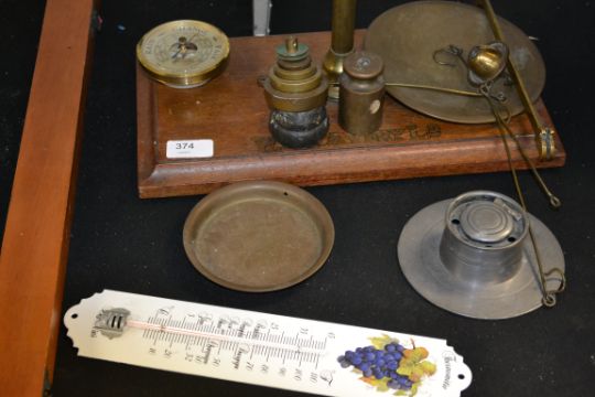 A mixed lot to include a vintage stick thermometer / barometer case, binoscope, barometer, inkwell and a vintage W+T Avery balance scales (AF) with weights.