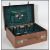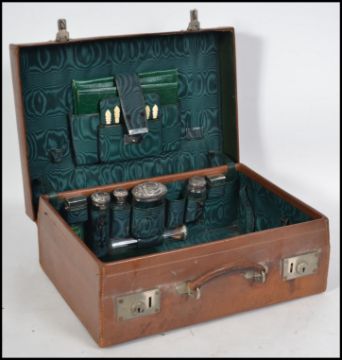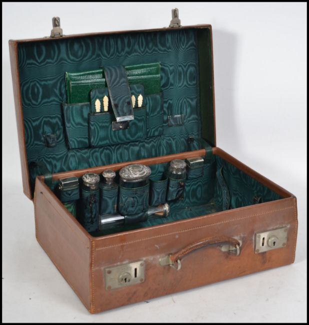 A silver hallmarked leather vanity suitcase. The green leather case with monogram top. Inside a fully appointed interior with hallmarked glass phials and bottles etc. Together with leather writing surface, leather covered book, picks and scissors etc. Silver bearing London hallmarks for 1904.