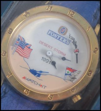 A collectable promotional cased Watch It watch from Fosters. The watch dating to 1991 commemorating Dessert Storm.