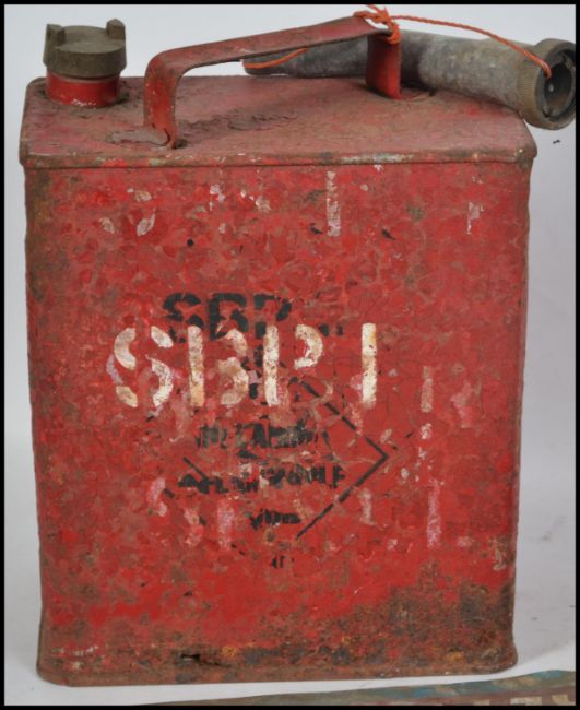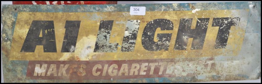 A vintage mid 20th century A1 Light Makes Cigarettes point of sale advertising sign together with a vintage painted red petrol can.