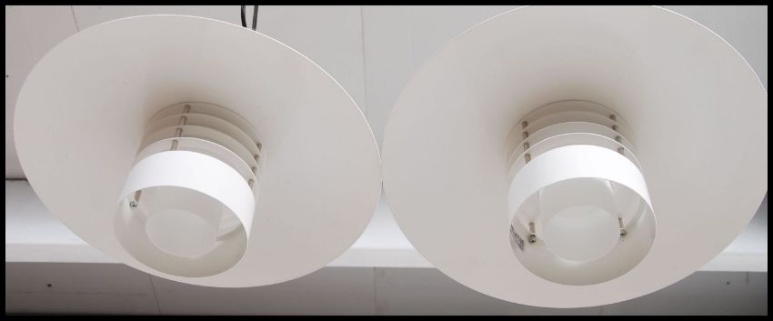 A set of 2 contemporary Industrial Glamox Luxo Aurora S ceiling lights of space age form being metal construction with original white painted finish. Matching further trio of these lights