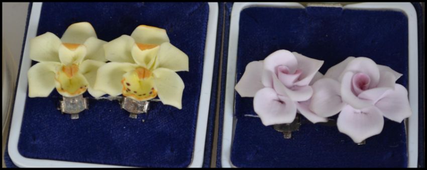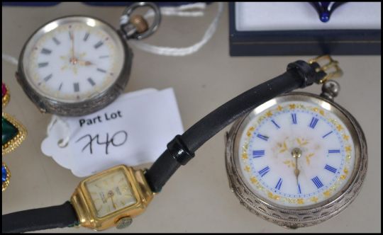 A collection of costume jewellery to include; A faux pearl triple corded necklace with blue cut glass clasp; A silver pocket watch with scroll work engraving to case and hallmarked to interior with a white enamel dial and roman numbers; two pairs of clip fastening boxed floral earrings; a gold plated wristwatch along with a rock crystal necklace with matching earrings.