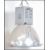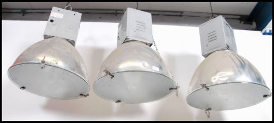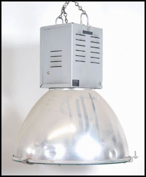 A pair of 20th century Industrial Hillclare factory pendant lights having half sphere polished aluminium pendant shades and block mounts atop marked for Hillclare. Further matching pairs in lot 1018 & 1083. Measures 60cm high x 47cm across.