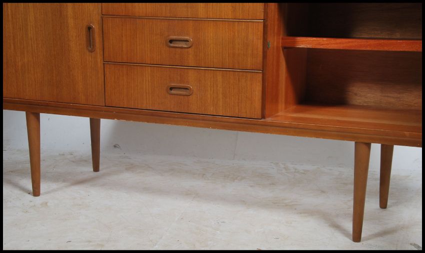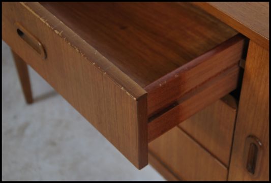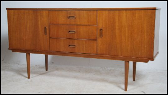 A retro 1970's Danish style sideboard raised on shaped supports having a series of cupboards and drawers. Measurements, 74cm high x 150cm wide x 41cm depth.