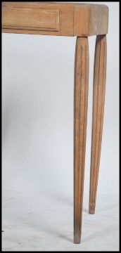 A 1930's Art Deco stripped oak French writing table desk being raised on reeded baluster legs with frieze top having inset single drawer. Measures 73cm high x 60cm wide x 40cm deep.