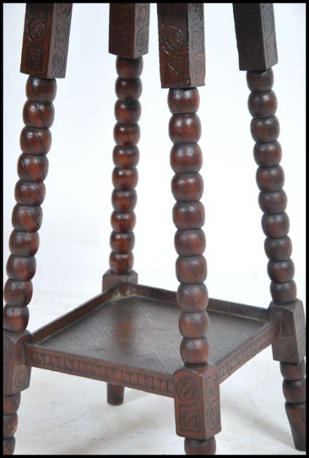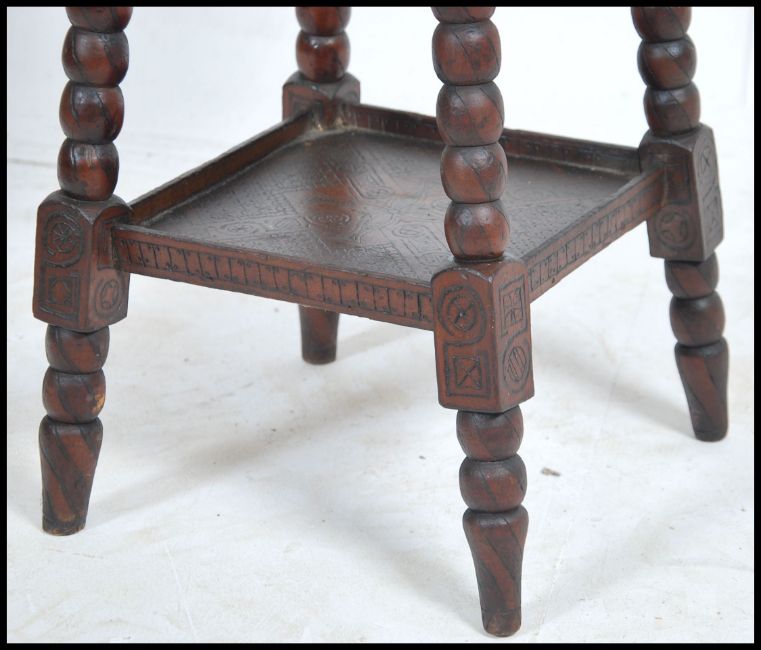 A 19th century carved mahogany gypsy side occasional table being raised on turned legs with carved twin tiers. Measures 68cm high x 38cm wide x 39cm deep.
