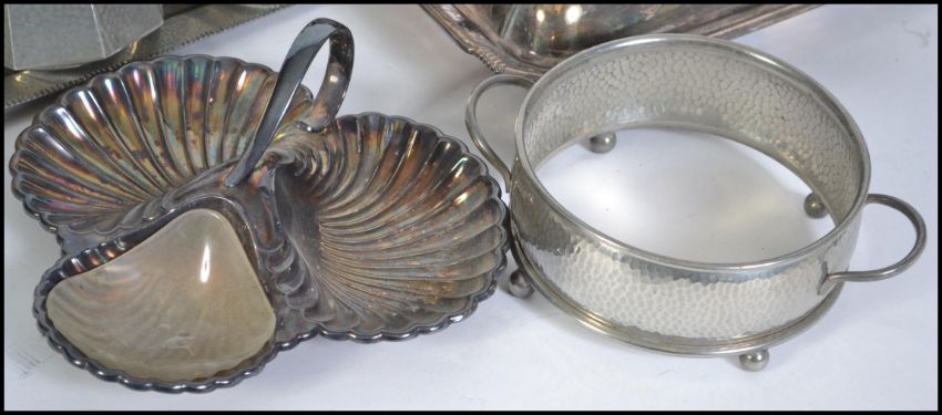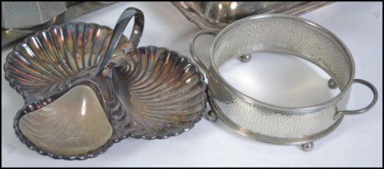 A collection of silver plated and pewter wares to include a Mayflower Pewter arts and crafts tea service, silver plated tureens, salver, trefoil centre dish etc