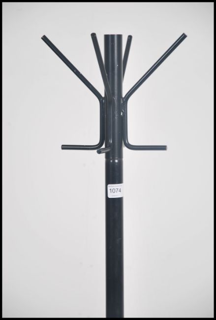 A vintage mid 20th century atomic style sputnik tubular metal coat / hat stand having angular hooks atop with black finish paintwork. Measures 165cm tall.