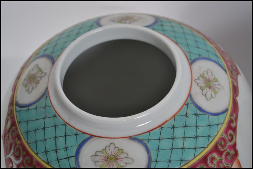 A Chinese famille rose ginger jar with scenes of Geisha's together with a Chinese blue and white salt glazed jar with scenes of fishing boats etc. The tallest measures 21cm high.