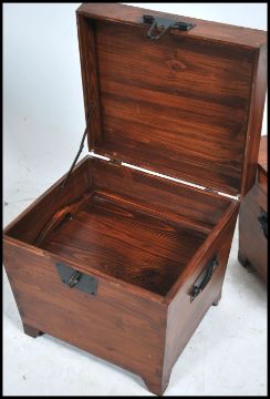 A pair of matching 20th century hardwood trunks / bedside chests. Having a hinged top opening to reveal a central removable tray. Metal handles to the sides and raised on castors.