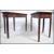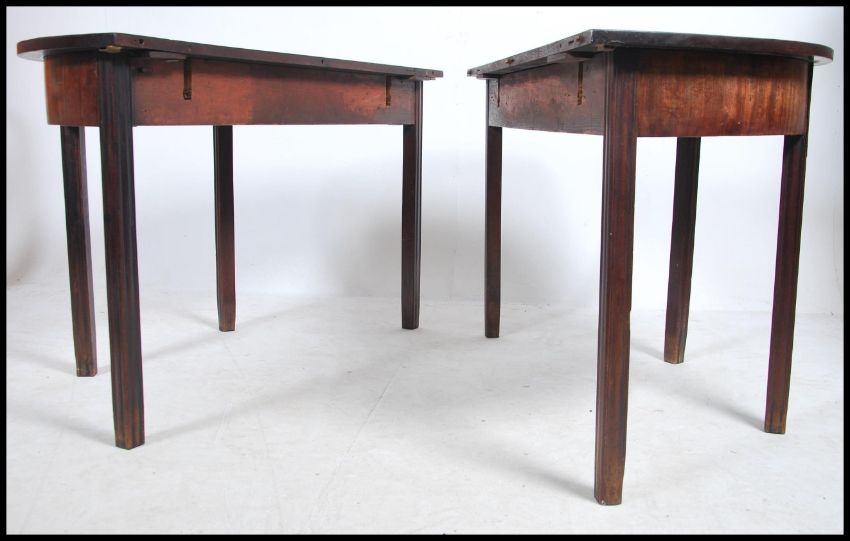 A pair of Georgian mahogany demi lune console hall tables, both raised on sqaured legs with fitted frieze frames having half moon tops. Placed together for circular dining table. Measures 72cm high x 122cm across.