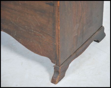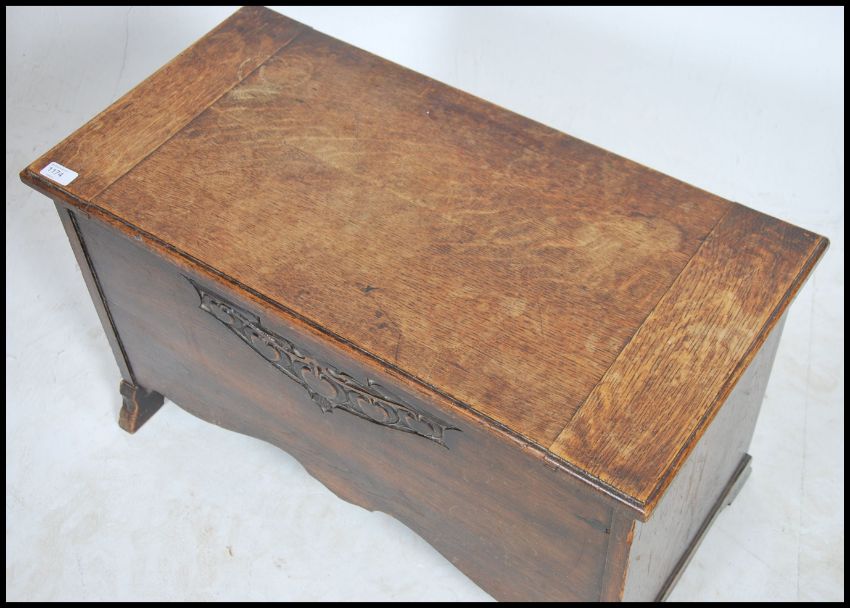A 19th century oak suffolk style country coffer of small form with carved panel front having hinged top above being raised on splayed and shaped supports. Measures 46cm high x 78cm wide x 38cm deep.
