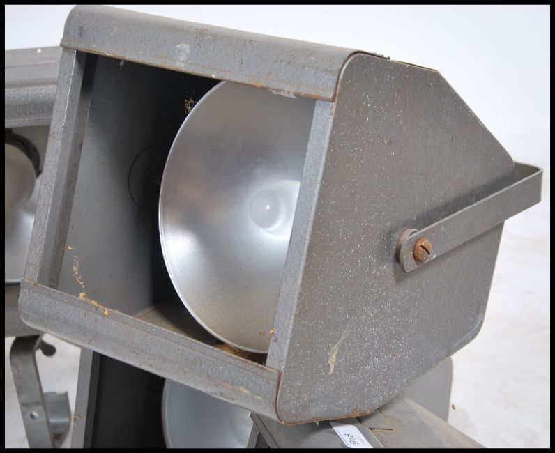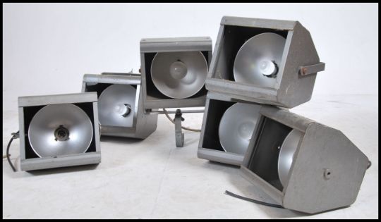 A collection of 6 vintage mid century Industrial theatre / cinema lights by Strand. Each with wall mount brackets and shades within etc ( please see illustrations ). Measures 25cm high x 25cm wide x 29cm deep.
