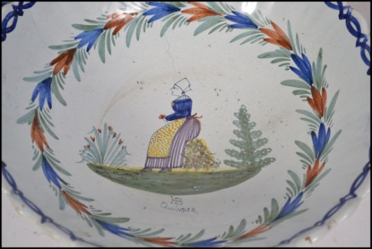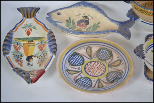 A collection of 19th and 20th century French Quimper ware ceramics to include bowls, jugs, dishes etc all with various scenes of people / places etc. The bowl measures 30cm across.
