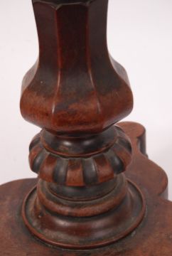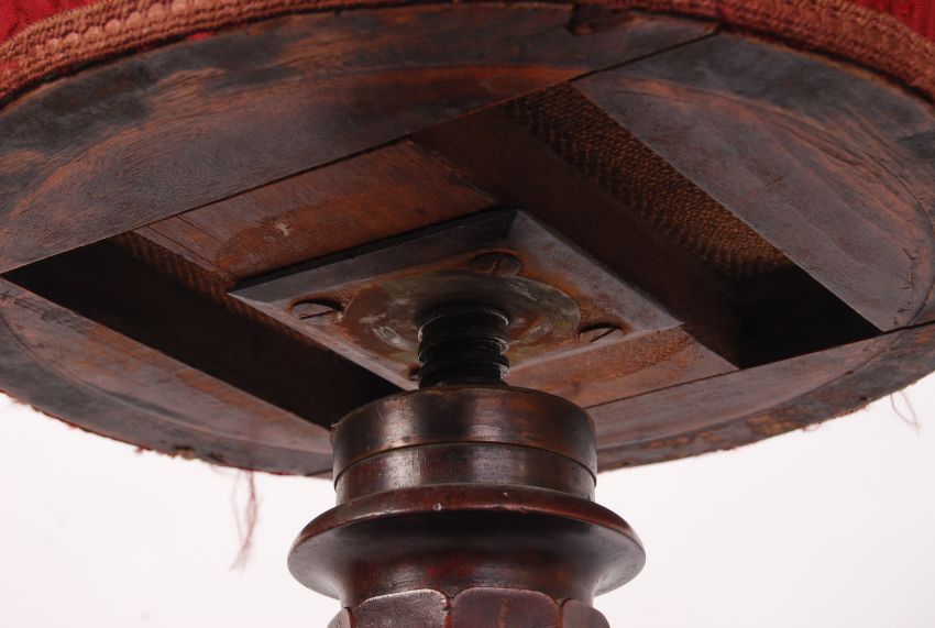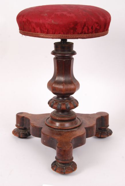 A William IV mahogany revolving piano stool having trefoil base with baluster column and revolving circular seat above