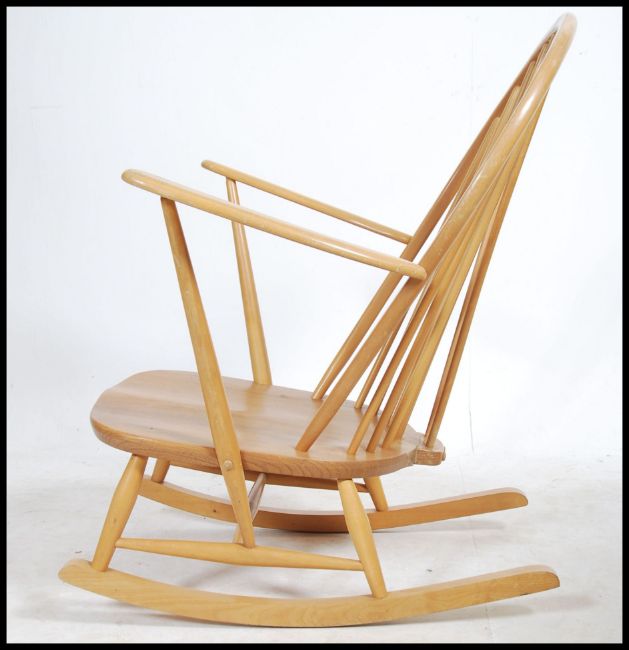 An Ercol Golden Dawn beech and elm wood Windsor / Quaker pattern rocking chair / armchair raised on sleigh runners. Measures 96cms high x 75cms wide x 80cms deep.