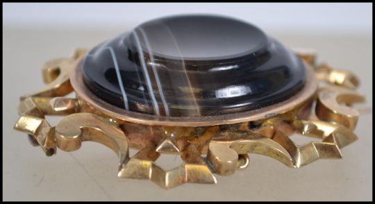 A heavy set 18ct gold large ladies agate set brooch. The thick 18ct gold surround with tigers eye oval stone having pin and chain to verso. To behind a glass hair locket panel ( glass with crack ) Size 6cms x 5cms / Total weight 42.7g