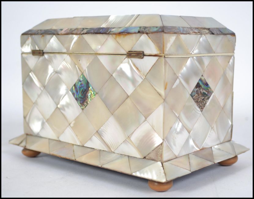 A mid Victorian mother of pearl and abalone shell tea caddy of rectangular form, the lid incorporating abalone shell border over angled plinth. The interior with two conforming lids. All raised on bun feet and  finished with a silver metal key escutcheon.