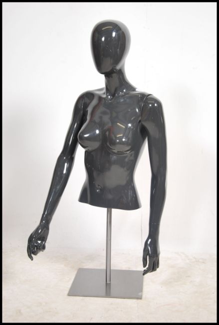 A high quality Italian made mannequin bust with removable adjustable arms and adjustable hands.  This high gloss slate grey modern design piece has a changeable height and brushed steel heavy base.