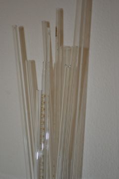 A vintage scientific chemical / lab large measuring cylinder along with a collection of thin measuring tubes and glass pipping / pipets.