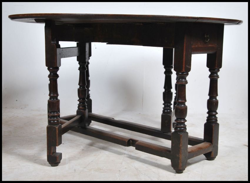 An 18th century country oak drop leaf / gate leg dining table being raised on turned legs with pad feet having half moon drop leaves raised on gate leg action with cutlery drawer to one end