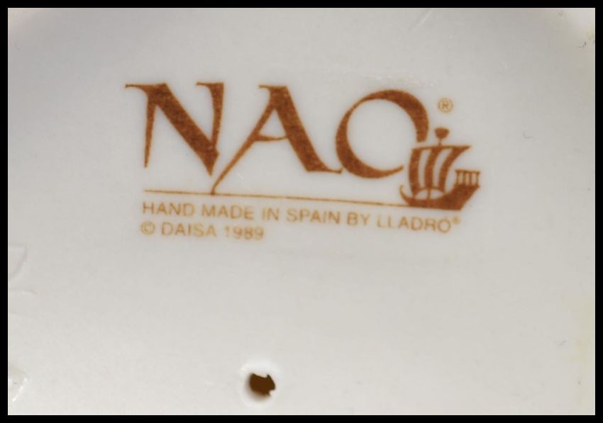 Two Nao female ceramic figurines.  One young girl raising her skirt with one hand; marked to base with Nao 1989.  The other, a young girl holding a candlestick with a full length dress and bow to the rear of her hair; marked to base Nao 1991. The tallest measures 27cm high.