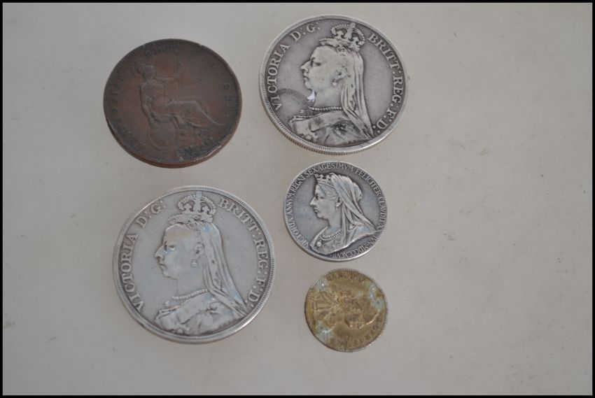 A group of Victorian and earlier coins to include two 1890s Jubilee bust full crowns, an 1837 diamond anniversary queen Victoria silver coin, an 1855 queen Victoria penny and an 1752 Franz 1 Austrian Ducat coin.