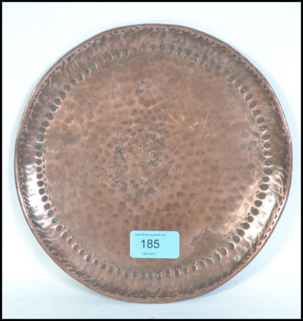 A late Victorian Arts & Crafts hand beaten copper plate by John Pearson of Newlyn. Impressed JP stamp verso, the plate with raised borders and pinch decoration. Measures 21cm across.