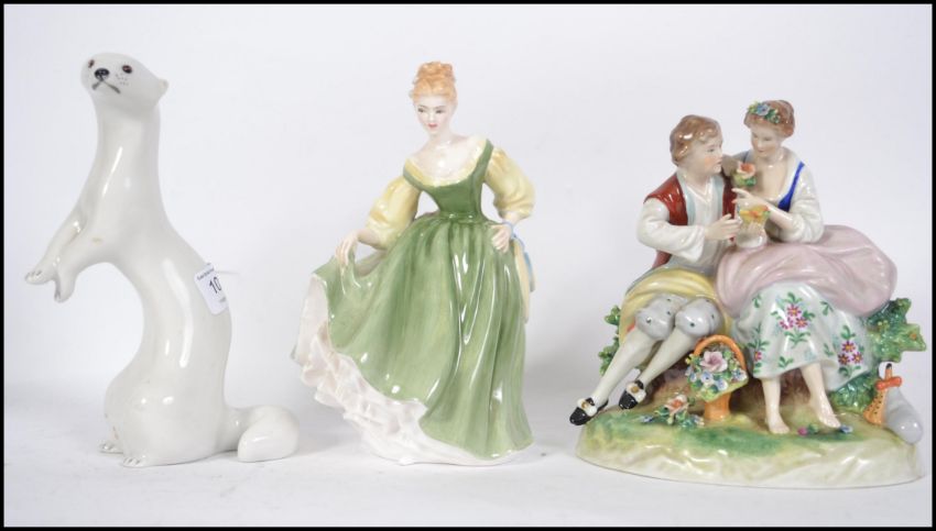 A retro mid century USSR figurine of an Otter together with a Royal Doulton Fair Lady HN2193 along with a Foreign Meissen type figurine. The tallest measures 20cm high.