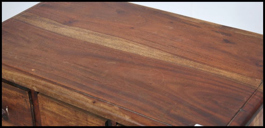 A 20th century hardwood chest of drawers, having an arrangement of nine index drawers raised on a plinth base. Measures 72cm high x 63cm wide x 37cm deep.