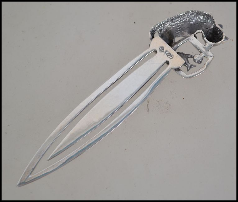 A contemporary pretty silver 925 bookmark of pierced tapering form, the mount with goldfish bowl and cat. Measures 8cm long.