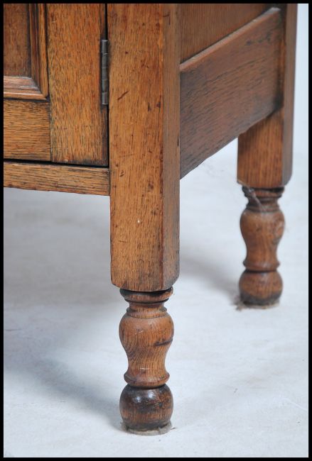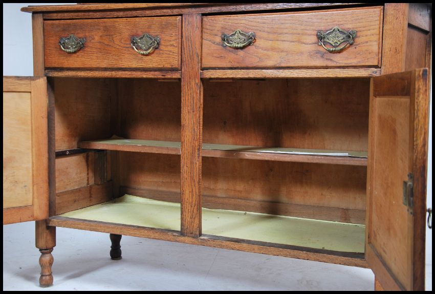 A 1920's oak dresser being raised on turned supports having a series of cupboards and drawers with upright plate rack atop. Dismantles into 2 pieces for ease of movement. Measures 201cm high x 122cm wide x 46cm deep.